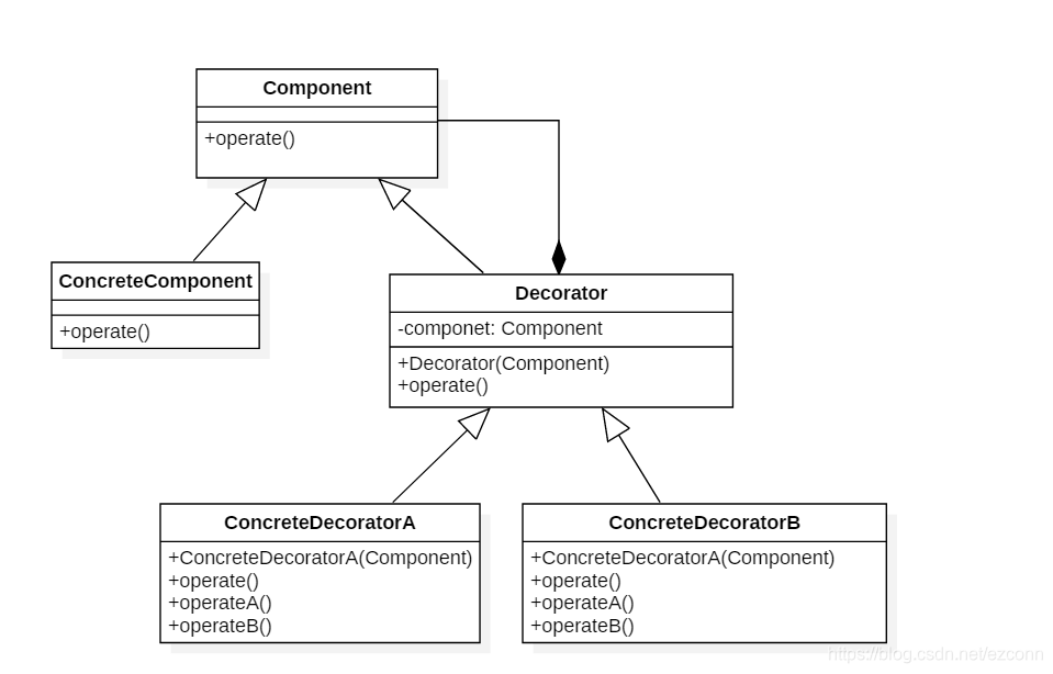 public class ConcreteComponent extends Component { @Override public void operate() { }} 抽象装饰类(如果装饰逻辑单一,只有一个的情况下我们可以省略该抽象类,直接是具体的装饰者)